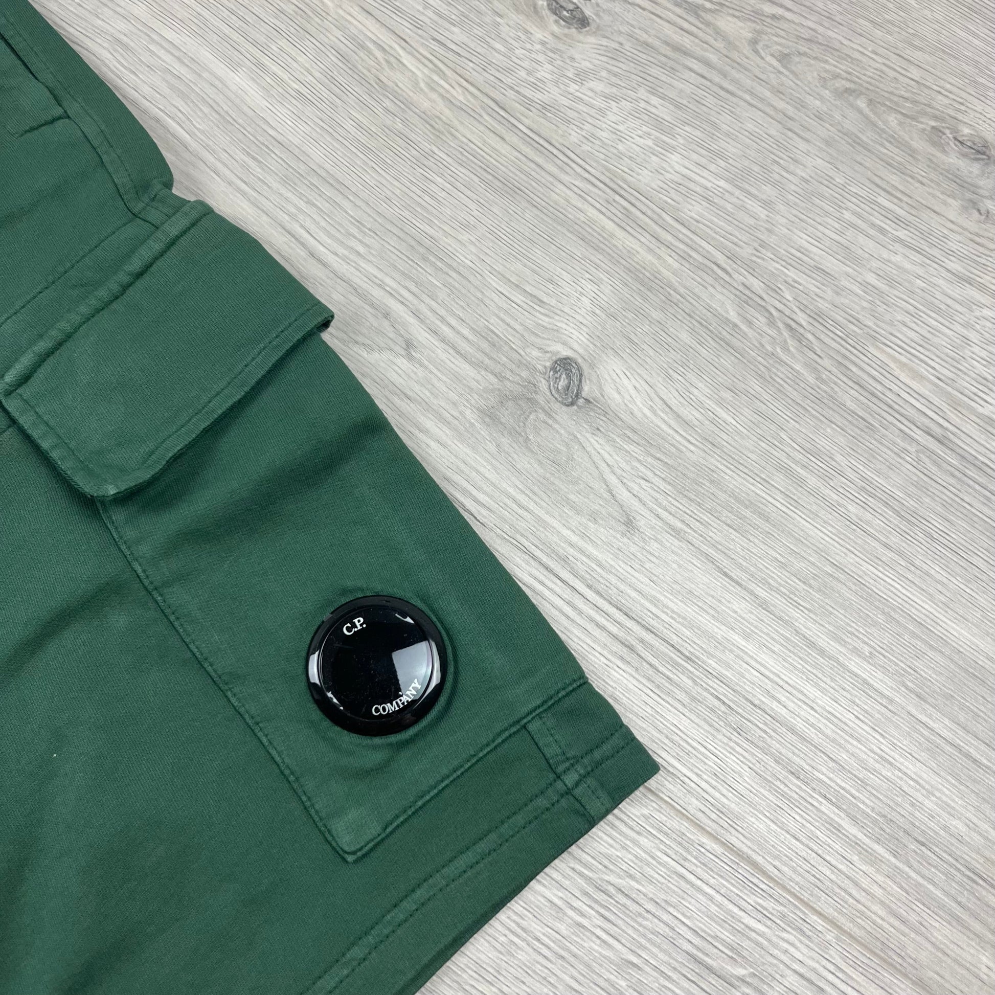 Duck Green CP Company jersey shorts with knee lens and cargo pocket